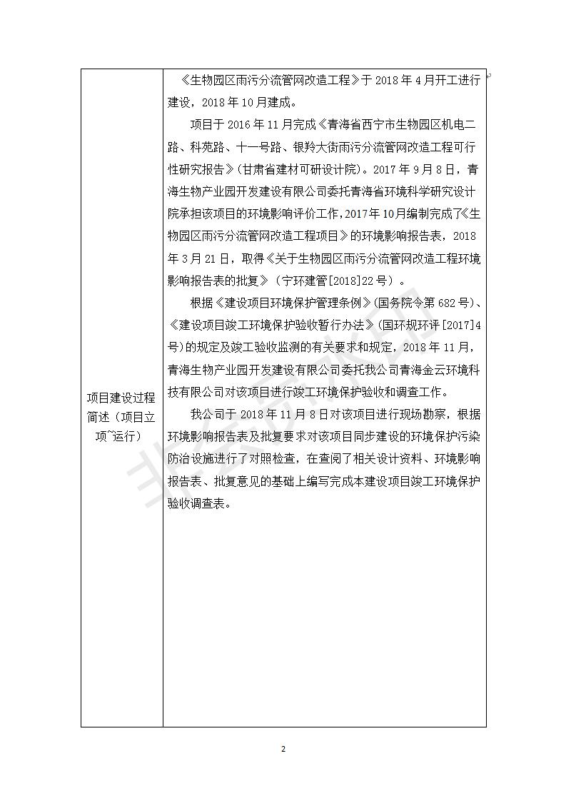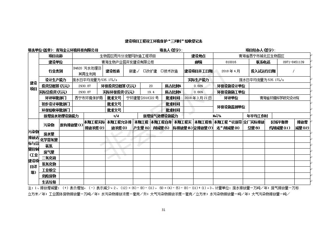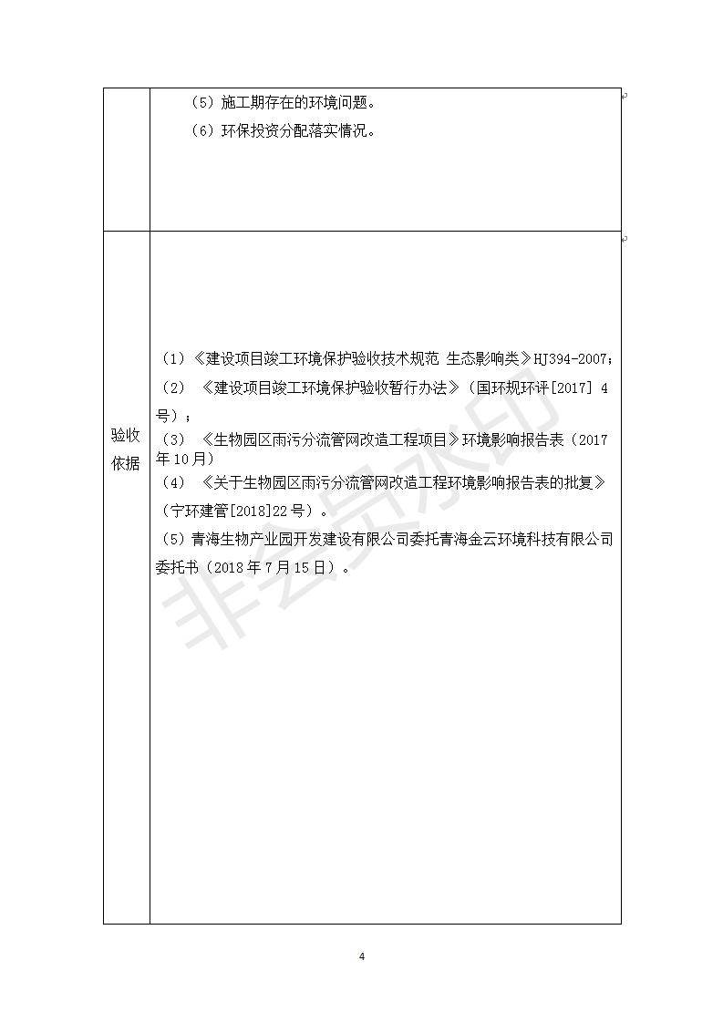 根據(jù)中華人民共和國國務院令第682號《國務院關于修改〈建設項目環(huán)境保護管理條例〉的決定》和《建設項目竣工環(huán)境保護驗收暫行辦法》(國務院令682)現(xiàn)將青海生物產(chǎn)業(yè)園開發(fā)建設有限公司生物園區(qū)雨污分流管網(wǎng)改造工程竣工環(huán)境保護驗收內(nèi)容(包括竣工環(huán)境保護驗收調(diào)查表和驗收意見)公示如下。