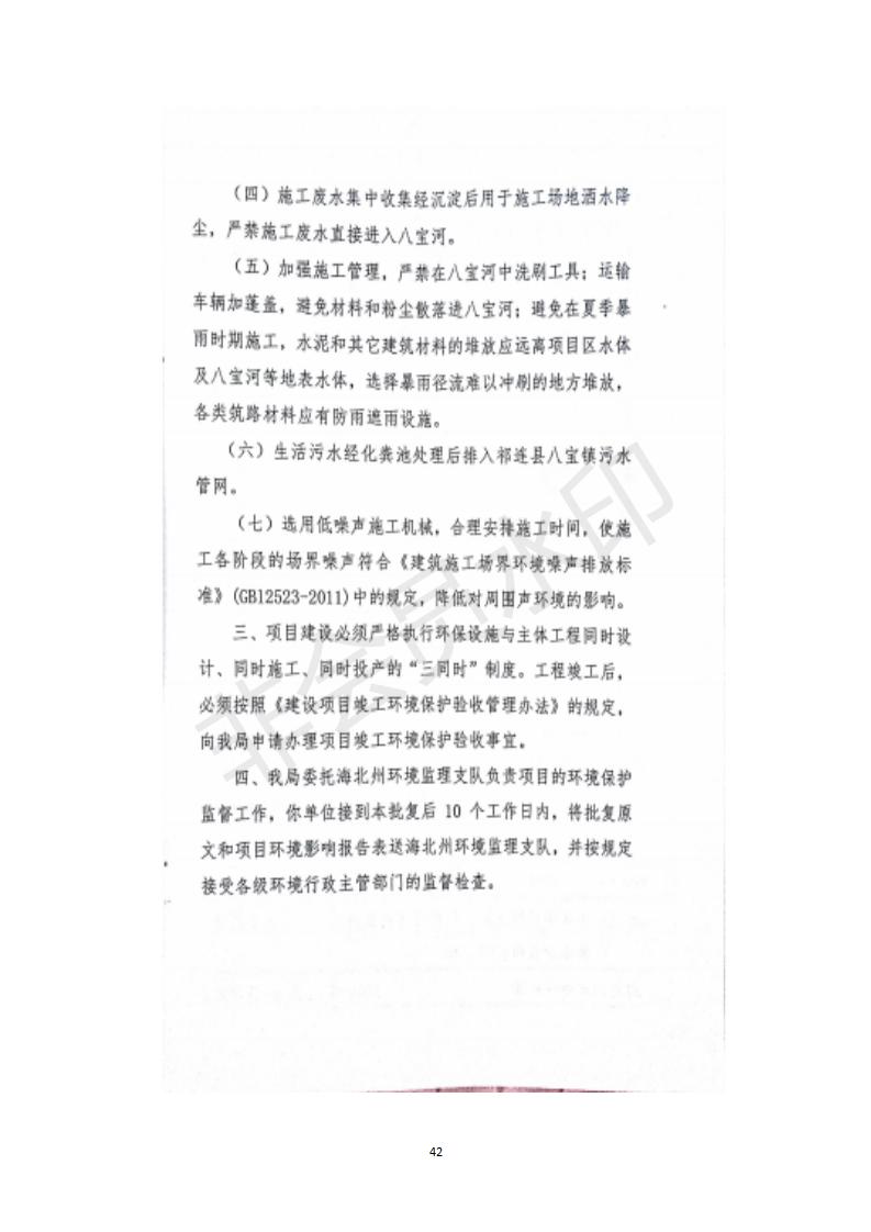 根據(jù)中華人民共和國務(wù)院令第682號《國務(wù)院關(guān)于修改〈建設(shè)項目環(huán)境保護(hù)管理條例〉的決定》和《建設(shè)項目竣工環(huán)境保護(hù)驗收暫行辦法》(國務(wù)院令682號),祁連縣二寺灘公園項目竣工環(huán)境保護(hù)驗收內(nèi)容(包括竣工環(huán)境保護(hù)驗收調(diào)查表和驗收意見)公示如下。 一、項目名稱:祁連縣二寺灘公園項目竣工環(huán)境保護(hù)驗收調(diào)查表 二、地點:祁連縣八寶鎮(zhèn)城東生態(tài)組團(tuán)片區(qū) 三、建設(shè)單位:祁連縣環(huán)境保護(hù)和林業(yè)局 四、建設(shè)內(nèi)容:公園廣場入口、水景景觀、輔助工程、綠化建設(shè) 五、公示時間:二〇一九年三月十一日至二〇一九年四月八日 六、聯(lián)系人:張工 公示期間,對上述公示內(nèi)容如有異議,請以書面形式反饋,個人須署真實姓名,單位須加蓋公章。