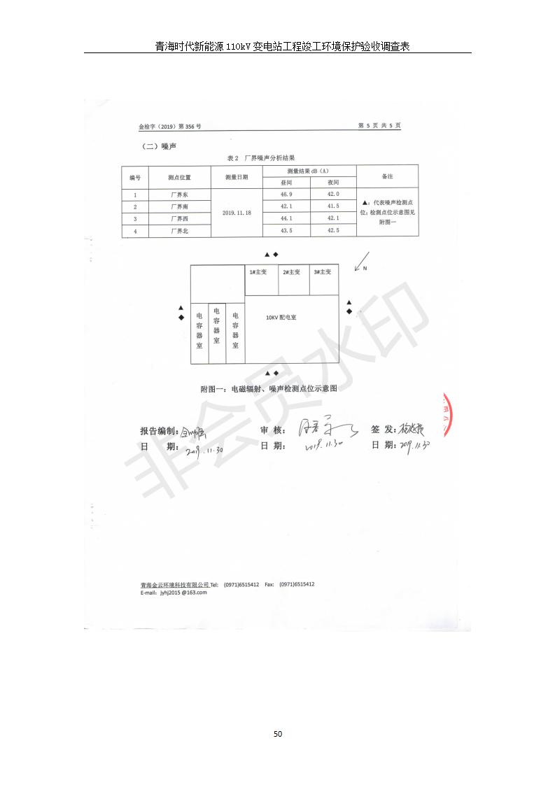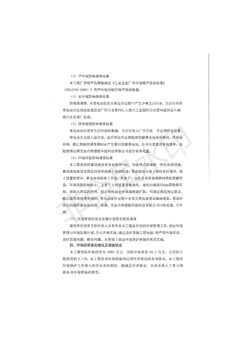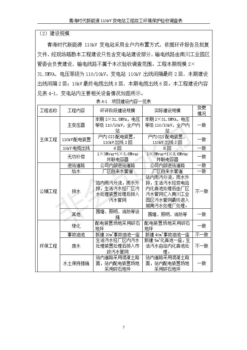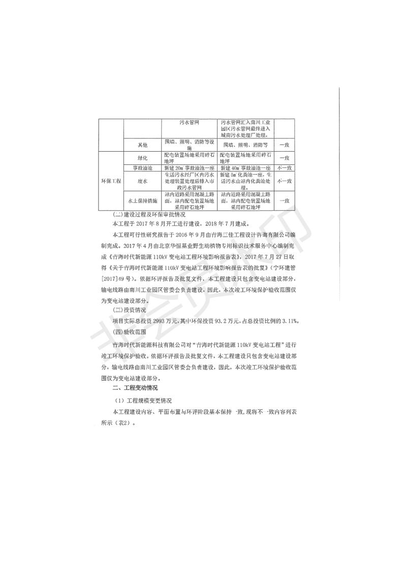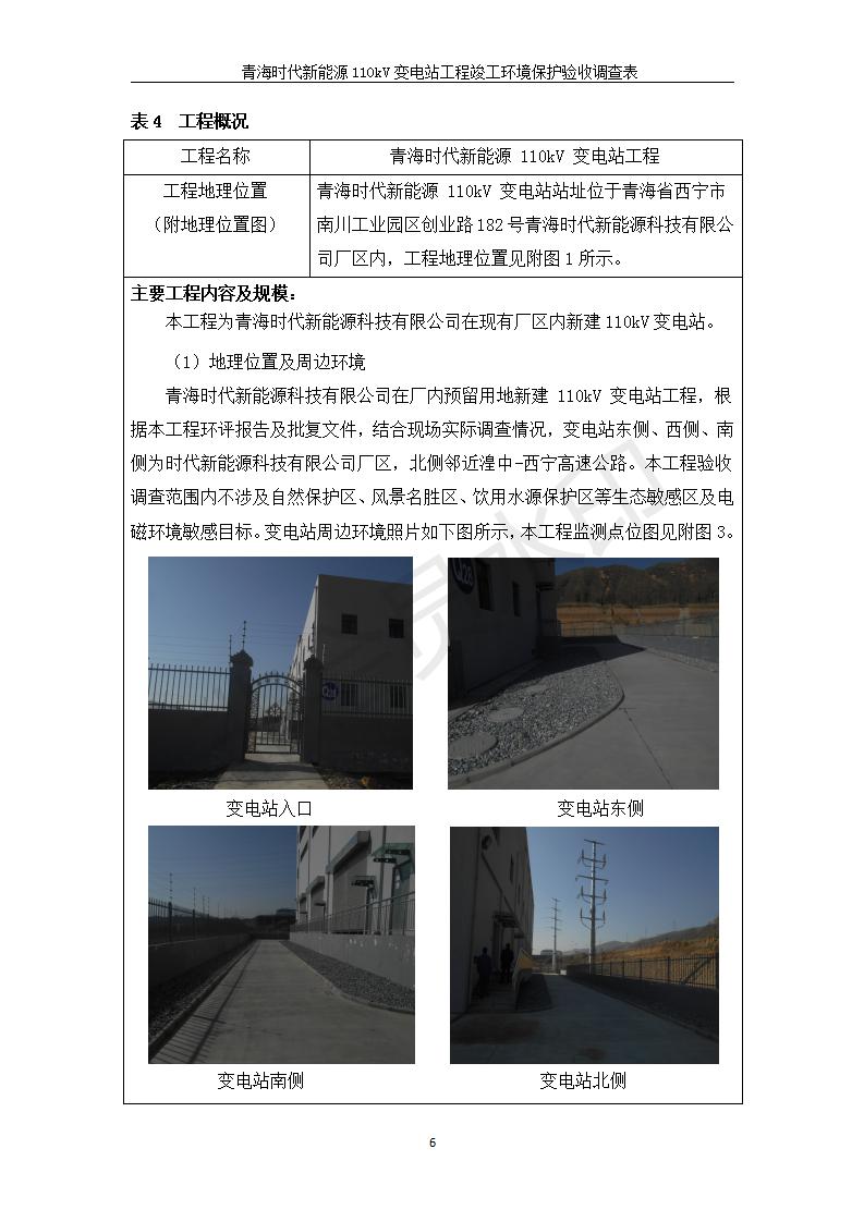 根據(jù)中華人民共和國國務(wù)院令第682號(hào)《國務(wù)院關(guān)于修改〈建設(shè)項(xiàng)目環(huán)境保護(hù)管理?xiàng)l例〉的決定》和《建設(shè)項(xiàng)目竣工環(huán)境保護(hù)驗(yàn)收暫行辦法》(國務(wù)院令682號(hào)),青海時(shí)代新能源110kV變電站工程(包括竣工環(huán)境保護(hù)驗(yàn)收調(diào)查表和驗(yàn)收意見)公示如下。 一、項(xiàng)目名稱:青海時(shí)代新能源110kV變電站工程 二、地點(diǎn):青海省西寧市南川工業(yè)園區(qū)創(chuàng)業(yè)路182號(hào)青海時(shí)代新能源科技有限公司廠區(qū)內(nèi) 三、建設(shè)單位:青海時(shí)代新能源科技有限公司 四、建設(shè)內(nèi)容:青海時(shí)代新能源 110kV 變電站采用全戶內(nèi)布置方式,依據(jù)環(huán)評(píng)報(bào)告及批復(fù)文件,經(jīng)現(xiàn)場(chǎng)踏勘本工程建設(shè)只包含變電站建設(shè)部分,輸電線路由南川工業(yè)園區(qū)管委會(huì)負(fù)責(zé)建設(shè),輸電線路不屬于本次驗(yàn)收調(diào)查范圍。工程本期規(guī)模2×31.5MVA,電壓等級(jí)為110/10kV。變電站 110kV 出線間隔最終2回,本期建設(shè)出線間隔2回;10kV最終電纜出線8回,本期電纜出線6回。 五、聯(lián)系人:張工 六、聯(lián)系電話:0971-6515411 七、公示時(shí)間:二〇二〇年一月十四日至二〇二〇年二月十三日 公示期間,對(duì)上述公示內(nèi)容如有異議,請(qǐng)以書面形式反饋,個(gè)人須署真實(shí)姓名,單位須加蓋公章。