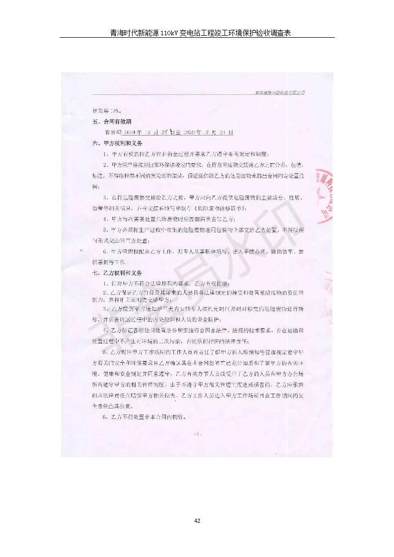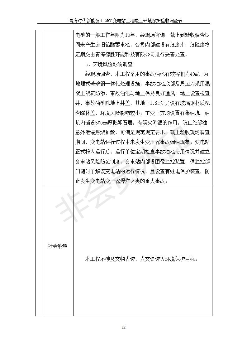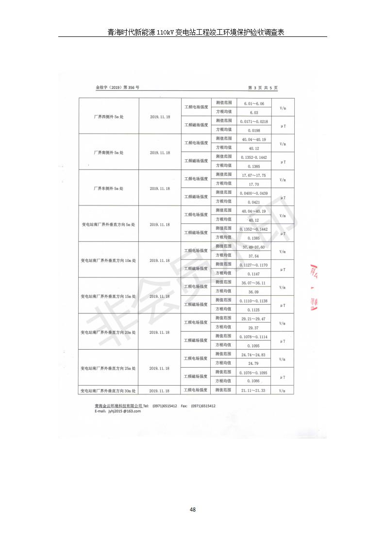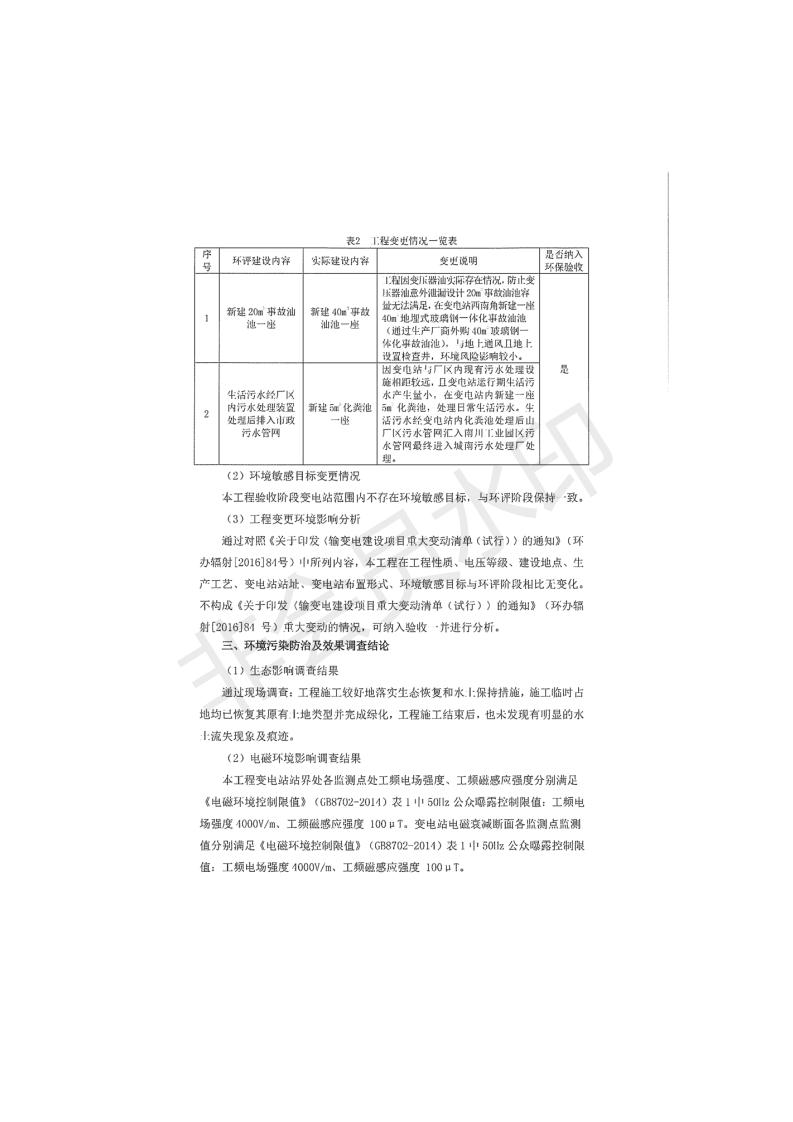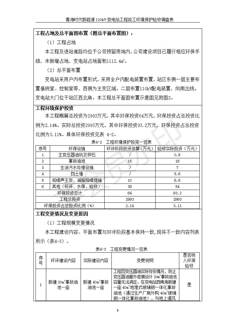 根據(jù)中華人民共和國國務(wù)院令第682號(hào)《國務(wù)院關(guān)于修改〈建設(shè)項(xiàng)目環(huán)境保護(hù)管理?xiàng)l例〉的決定》和《建設(shè)項(xiàng)目竣工環(huán)境保護(hù)驗(yàn)收暫行辦法》(國務(wù)院令682號(hào)),青海時(shí)代新能源110kV變電站工程(包括竣工環(huán)境保護(hù)驗(yàn)收調(diào)查表和驗(yàn)收意見)公示如下。 一、項(xiàng)目名稱:青海時(shí)代新能源110kV變電站工程 二、地點(diǎn):青海省西寧市南川工業(yè)園區(qū)創(chuàng)業(yè)路182號(hào)青海時(shí)代新能源科技有限公司廠區(qū)內(nèi) 三、建設(shè)單位:青海時(shí)代新能源科技有限公司 四、建設(shè)內(nèi)容:青海時(shí)代新能源 110kV 變電站采用全戶內(nèi)布置方式,依據(jù)環(huán)評(píng)報(bào)告及批復(fù)文件,經(jīng)現(xiàn)場(chǎng)踏勘本工程建設(shè)只包含變電站建設(shè)部分,輸電線路由南川工業(yè)園區(qū)管委會(huì)負(fù)責(zé)建設(shè),輸電線路不屬于本次驗(yàn)收調(diào)查范圍。工程本期規(guī)模2×31.5MVA,電壓等級(jí)為110/10kV。變電站 110kV 出線間隔最終2回,本期建設(shè)出線間隔2回;10kV最終電纜出線8回,本期電纜出線6回。 五、聯(lián)系人:張工 六、聯(lián)系電話:0971-6515411 七、公示時(shí)間:二〇二〇年一月十四日至二〇二〇年二月十三日 公示期間,對(duì)上述公示內(nèi)容如有異議,請(qǐng)以書面形式反饋,個(gè)人須署真實(shí)姓名,單位須加蓋公章。