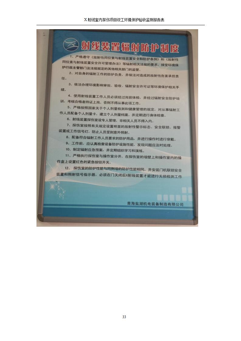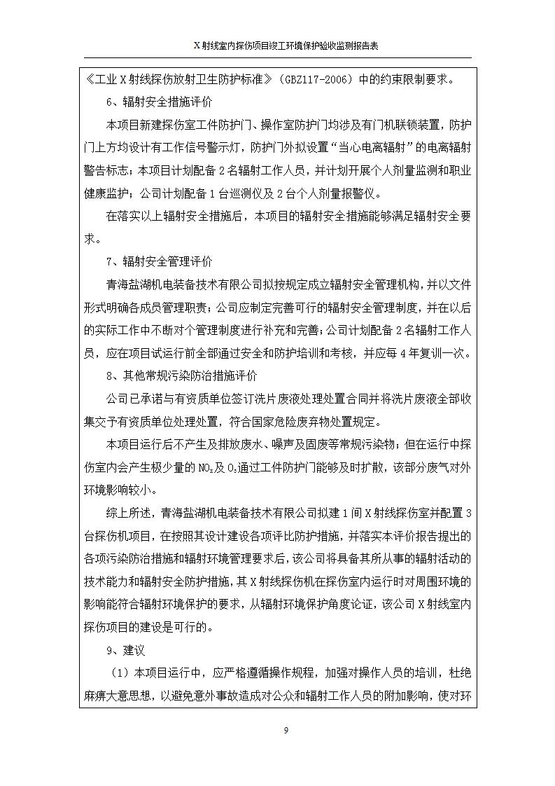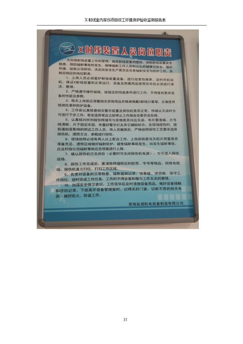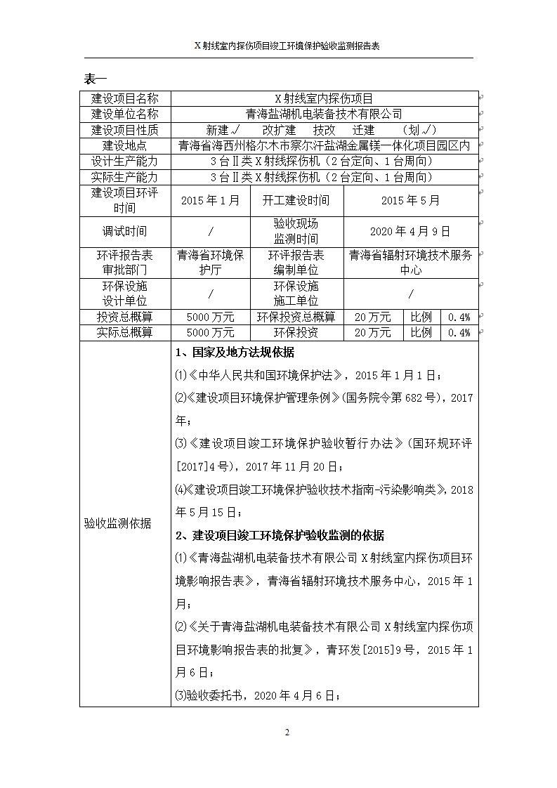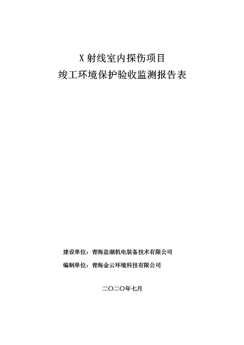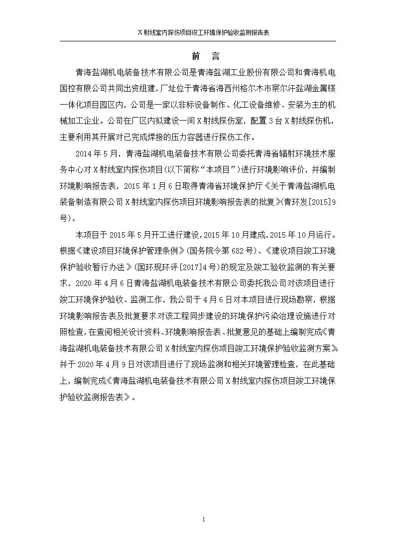 青海鹽湖機電裝備技術有限公司X射線室內探傷項目竣工環(huán)境保護驗收監(jiān)測報告表公示